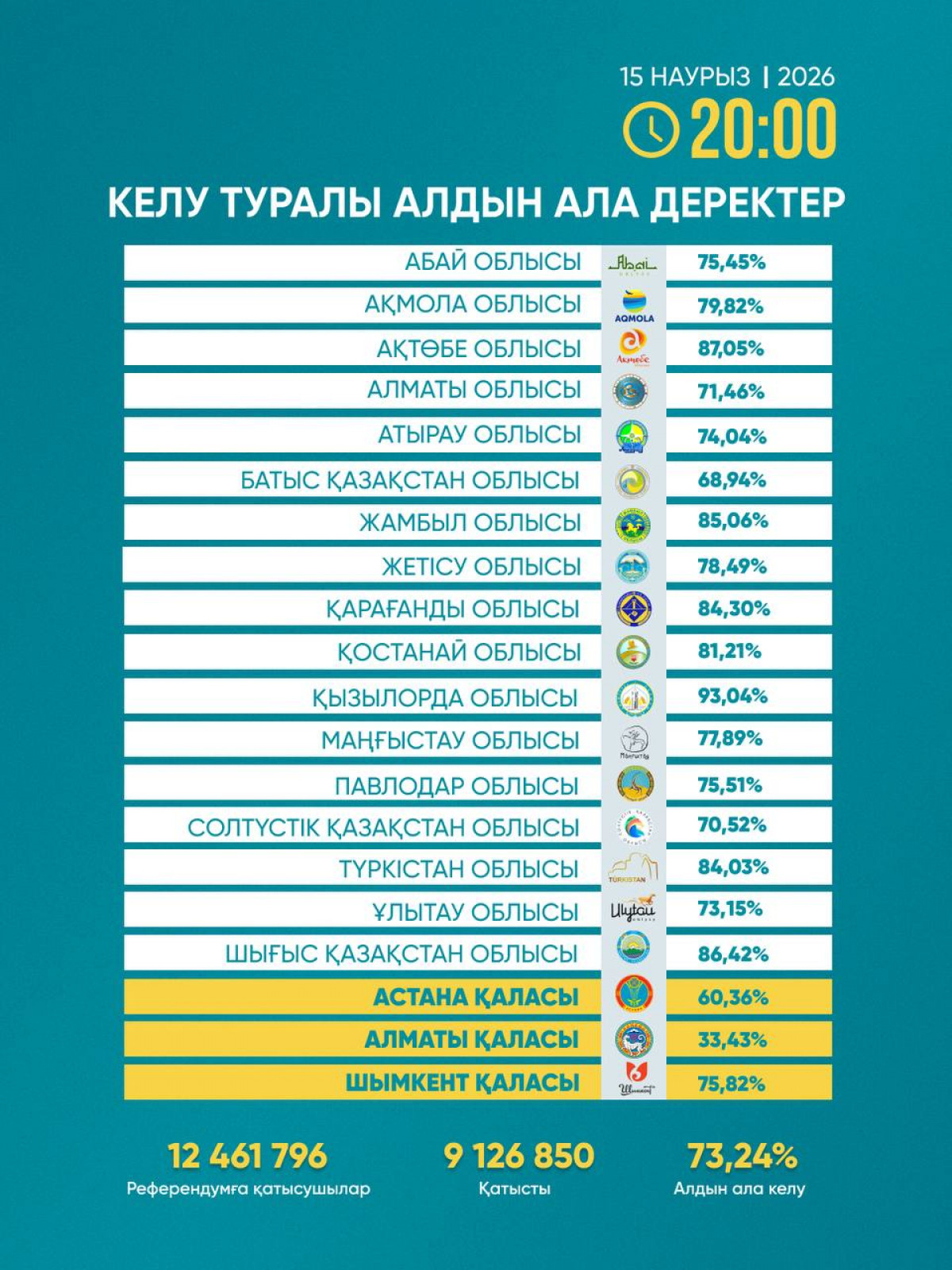 Жалпы сағат 20.00-дегі жағдай бойынша республиканың 9 126 850 азаматы бюллетень алды. Ол тізімге енгізілген азаматтардың 73,24 пайызын құрады.