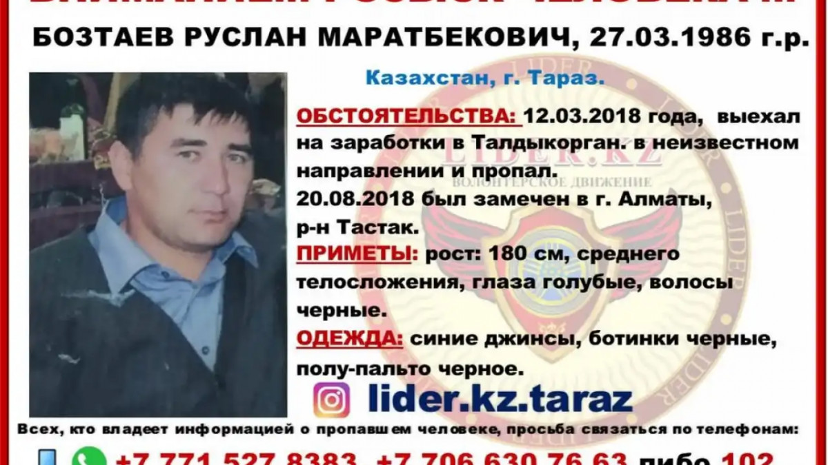 Іздеу туралы мәлімет volontery_almaty_lider.kz еріктілер қозғалысының Instagram-парақшасында жарияланды. Ондағы ақпаратқа сәйкес, Руслан Бозтаев 2018 жылғы 12 наурыз күні Жуалы ауданына қарасты Бауыржан Момышұлы ауылындағы үйінен жұмыс іздеу мақсатында кеткен.